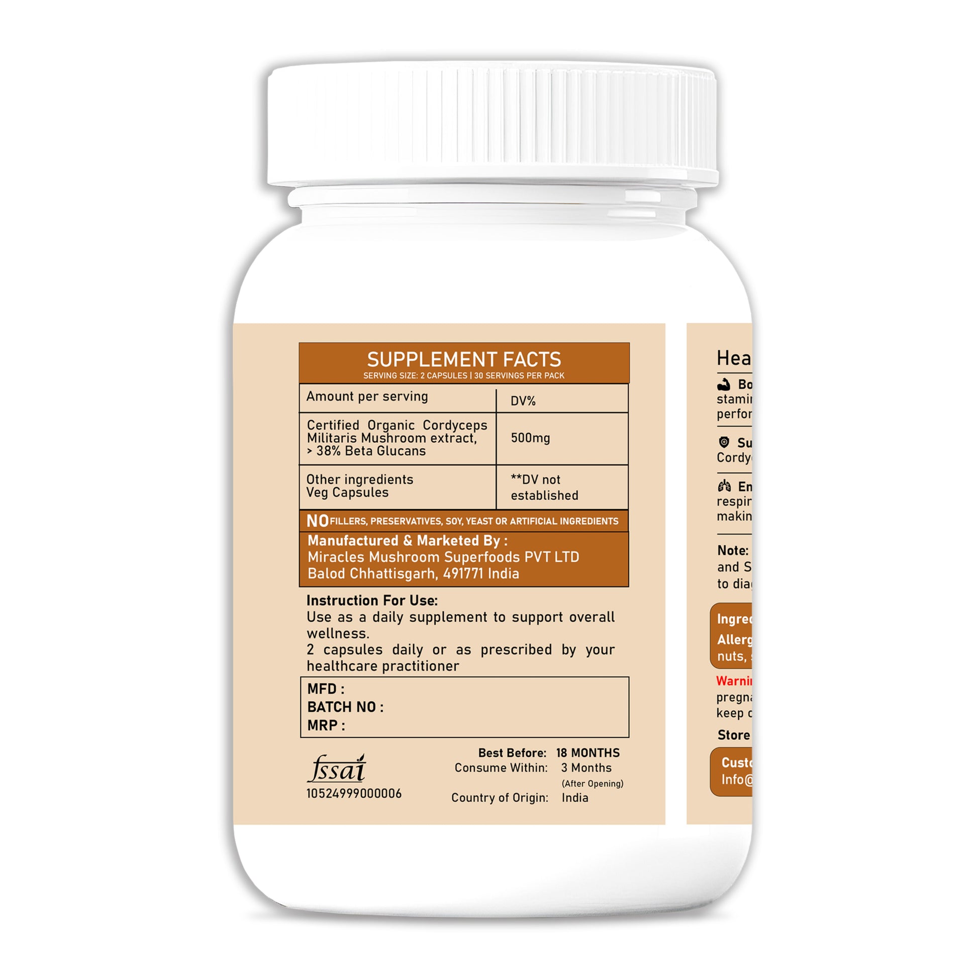 Made with 100% Pure Cordyceps Mushroom Extract (standardized for cordycepin & beta-glucans) in plant-based vegetable capsules. Free from fillers, additives, or preservatives.