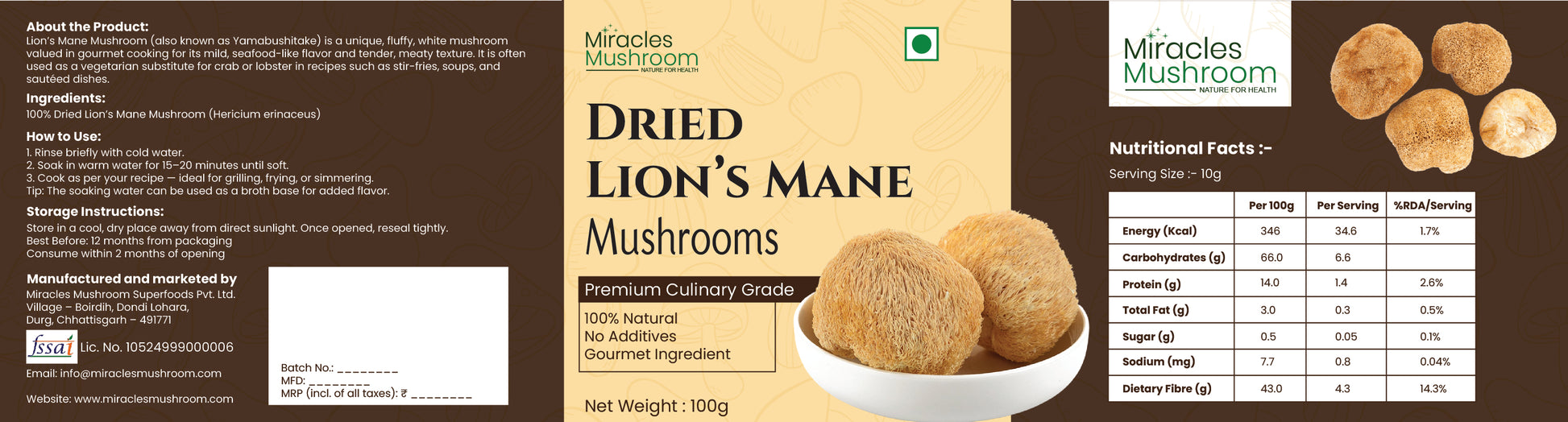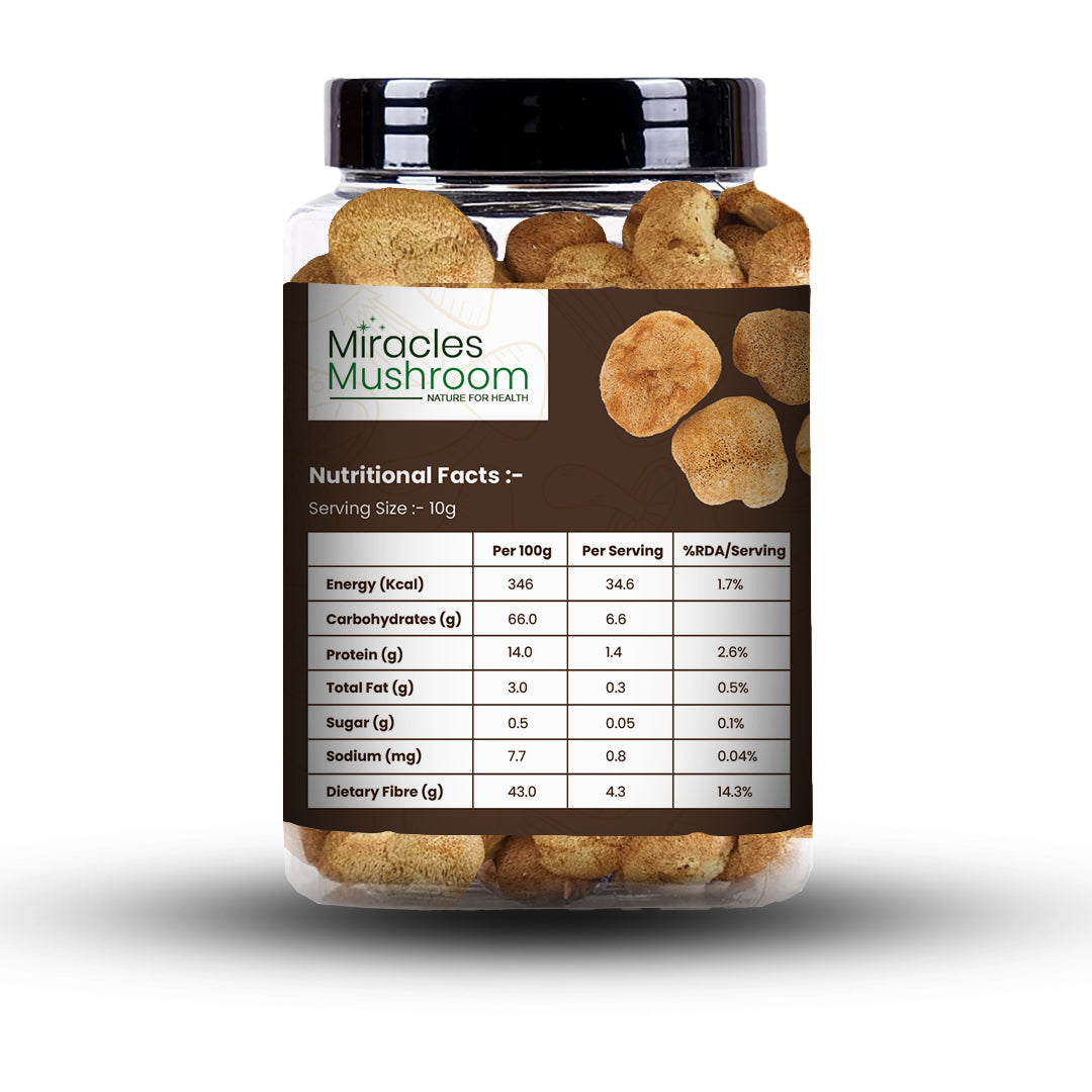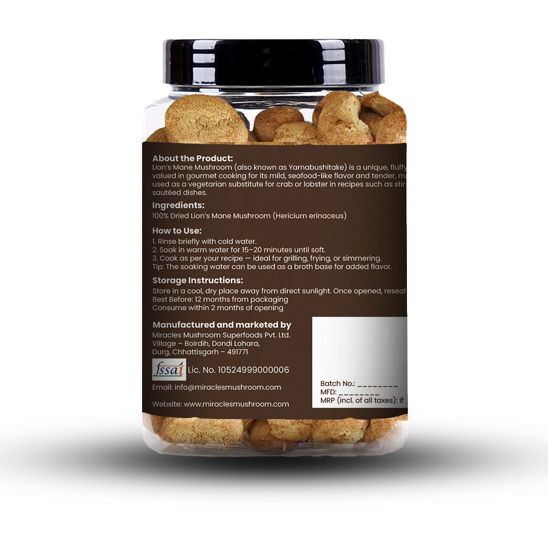- 100% natural Lion’s Mane mushrooms, free from additives & preservatives.