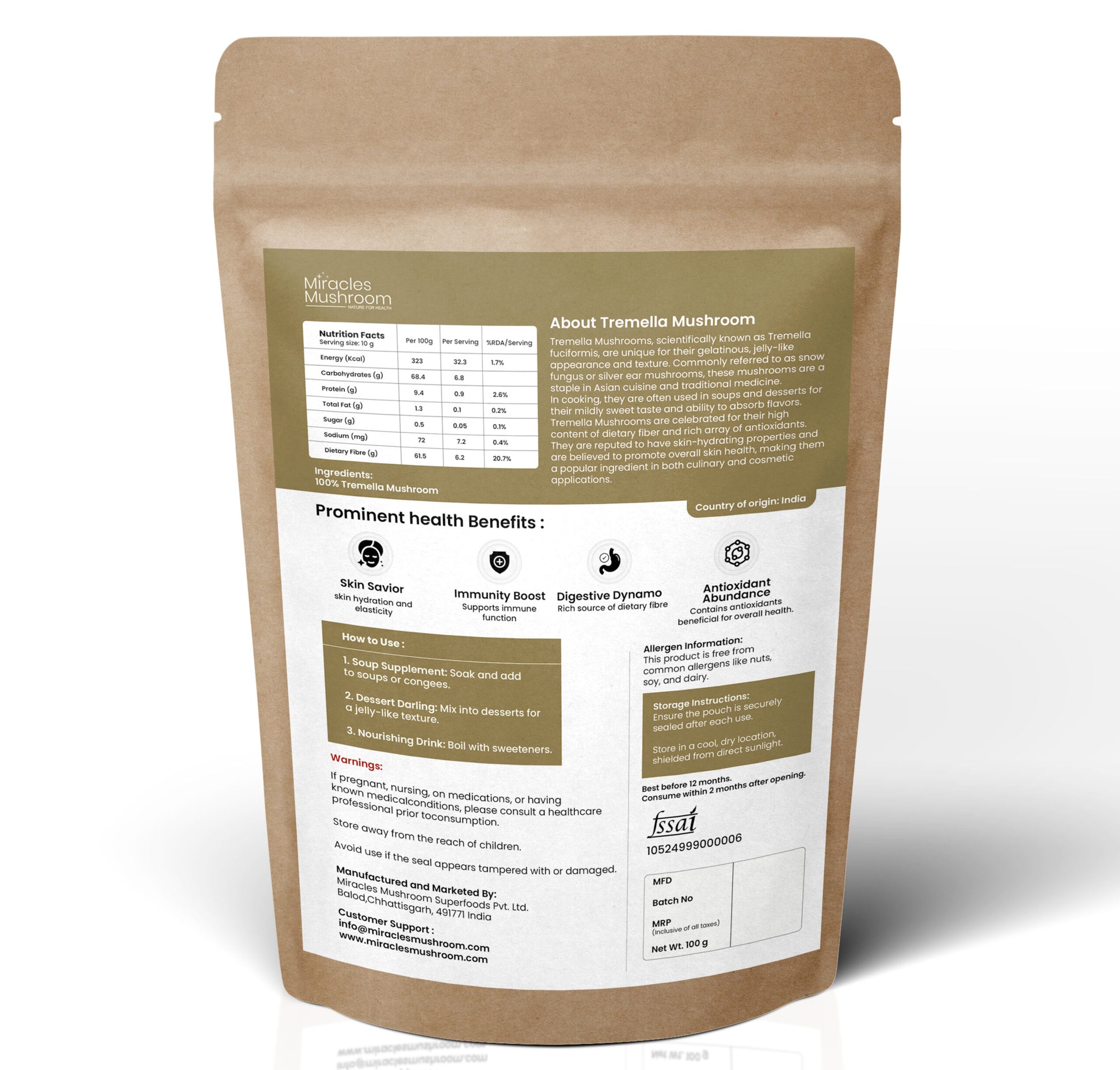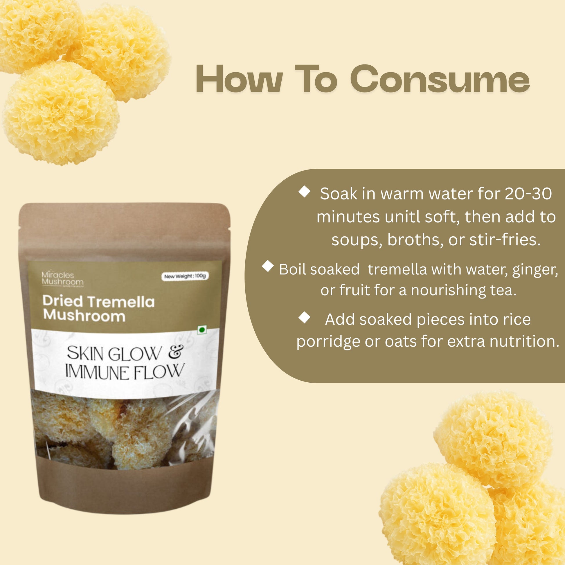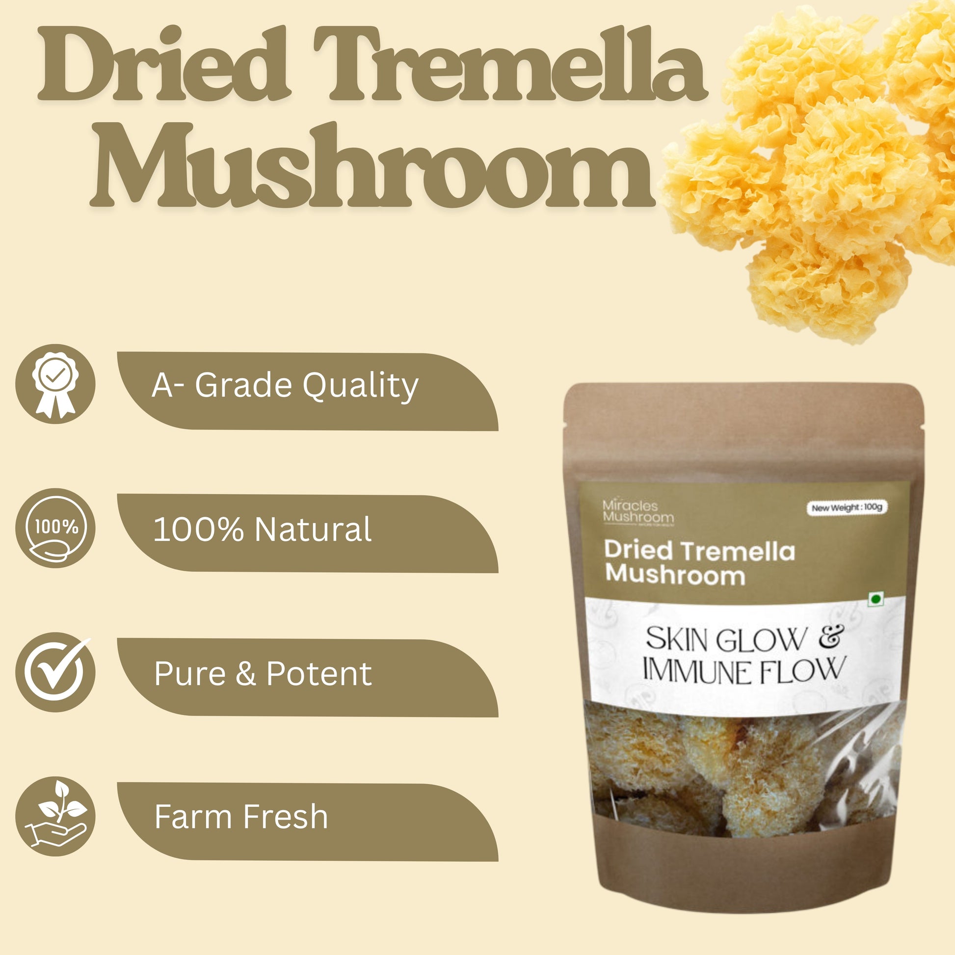 - 100% natural Tremella (Snow Fungus), free from additives & preservatives.