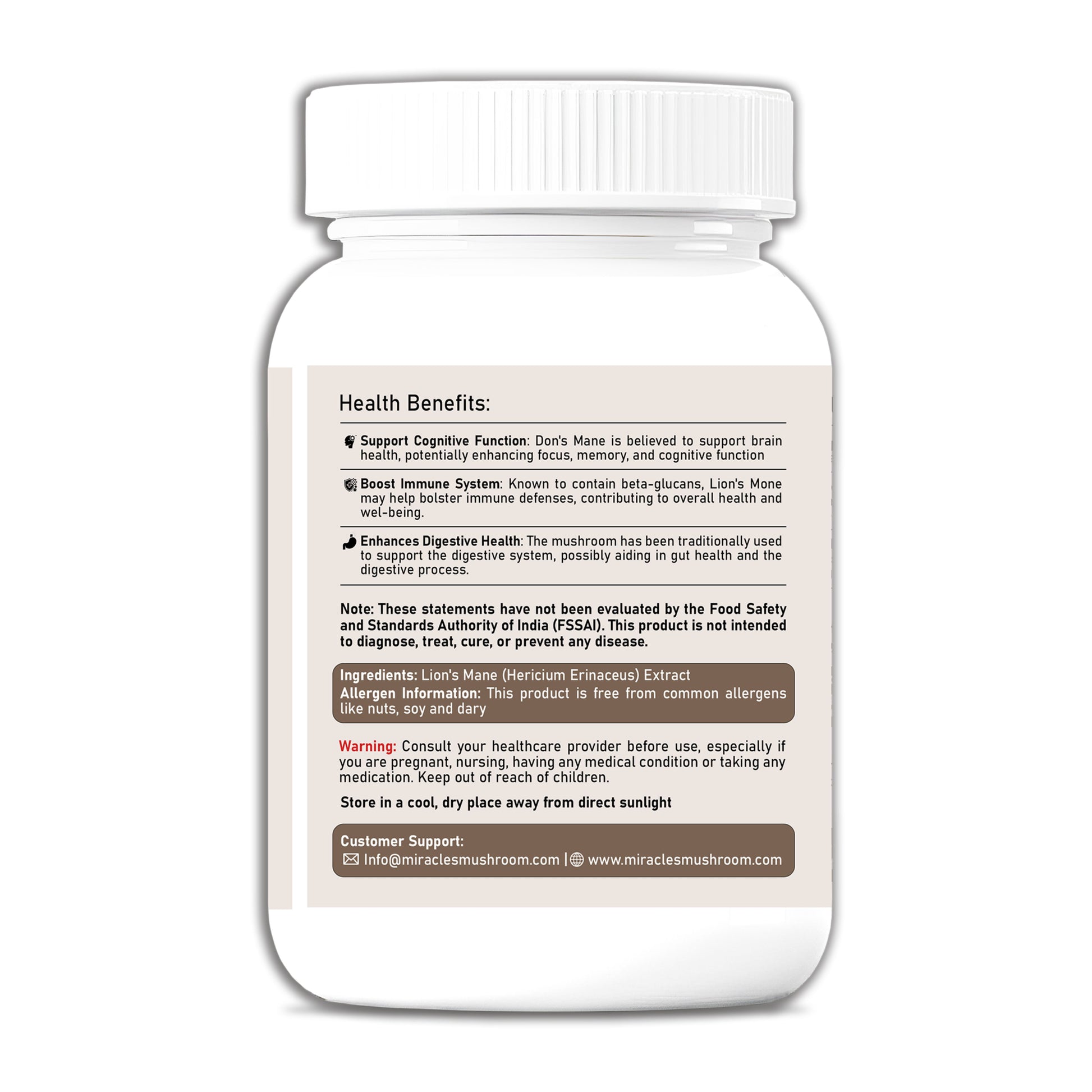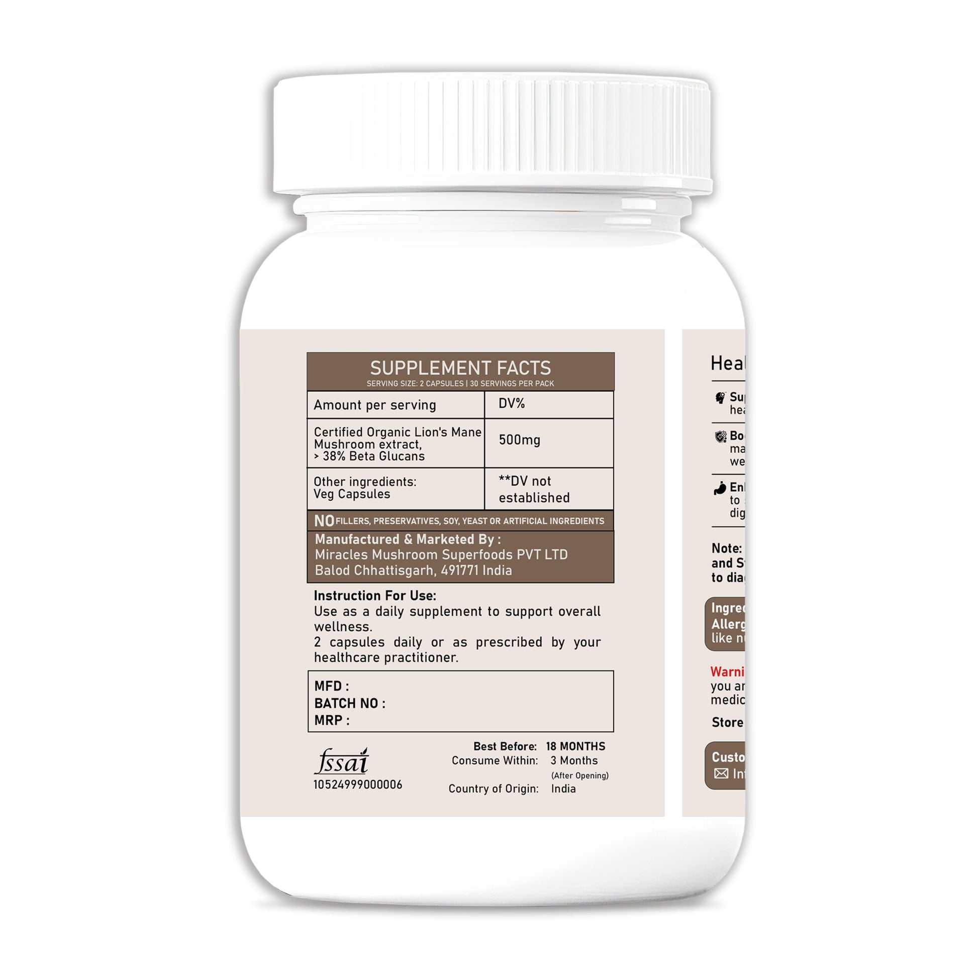 - Formulated with 100% Pure Lion’s Mane Mushroom Extract in plant-based vegetable capsules, free from fillers, additives, or preservatives.